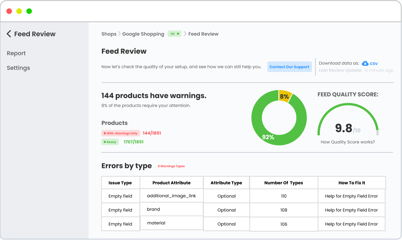 Use the Feed Review report to check your feed before completing your product upload. The report includes a detailed list of errors and exact steps to fix them.