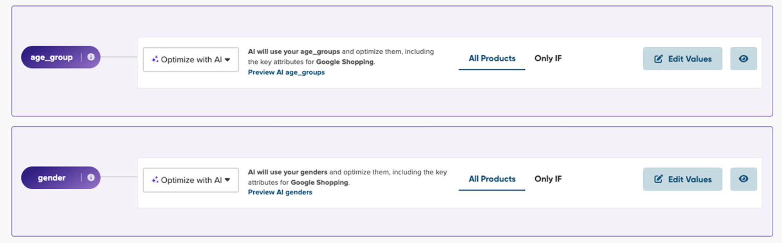 You also remain in control of what product data is sent to the channels you’re advertising on with the ability to edit any of the AI-generated values.