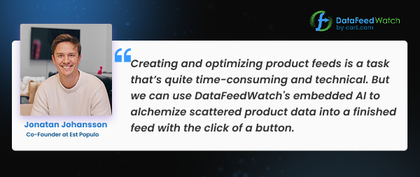 Digital advertising agencies also have found the AI useful for their clients. Jonatan Johansson, CEO at digital agency Est Populo, commented on how DataFeedWatch AI has helped their agency.