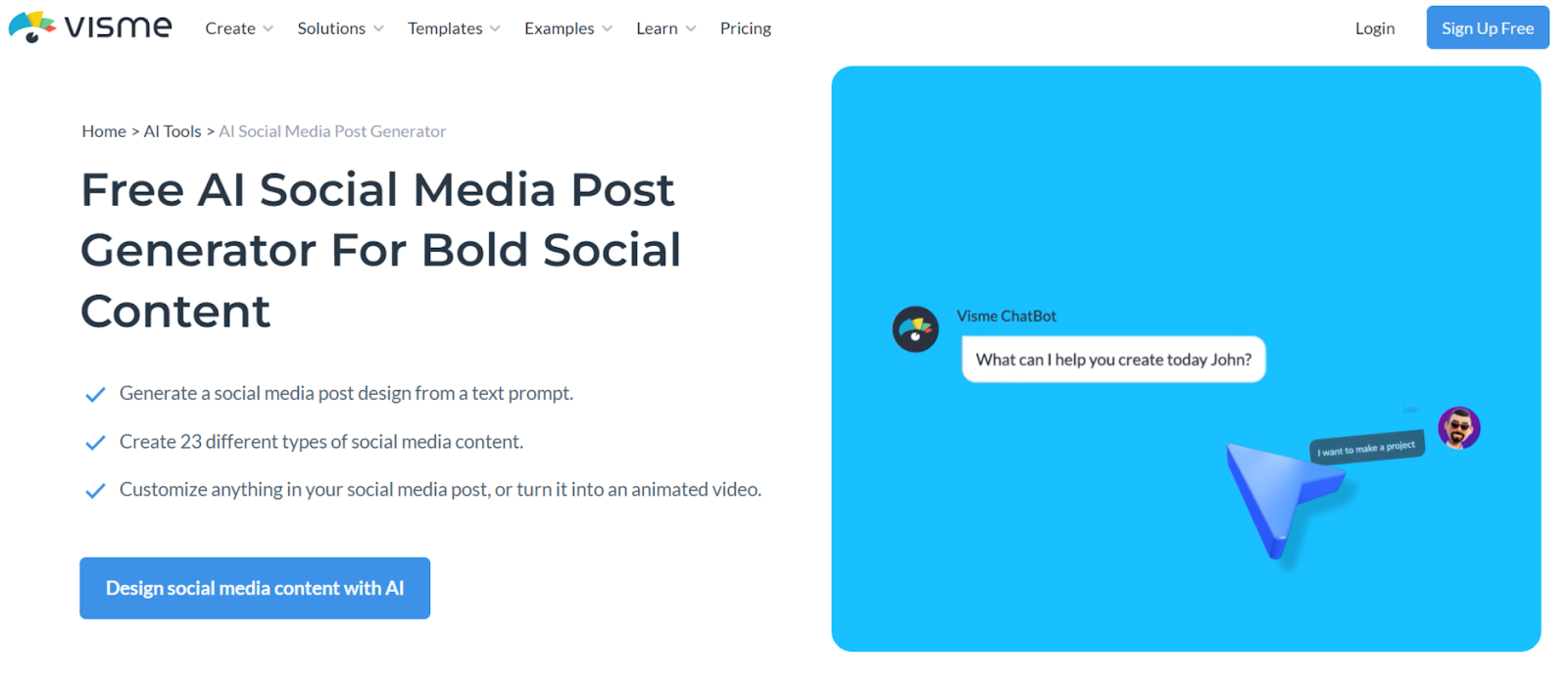 Visme is a versatile design platform backed by AI. You can create nearly everything with a single prompt using Visme’s AI social media generator. The better the prompt, the more engaging the content. The process is easier, you can create a draft within the dashboard.