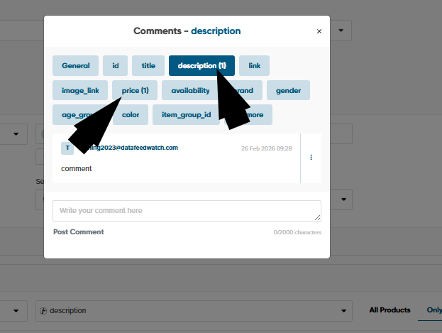 The Comments feature has been created with both our admins and DataFeedWatch clients (and customers of our customers) in mind. It can be used for communication between: