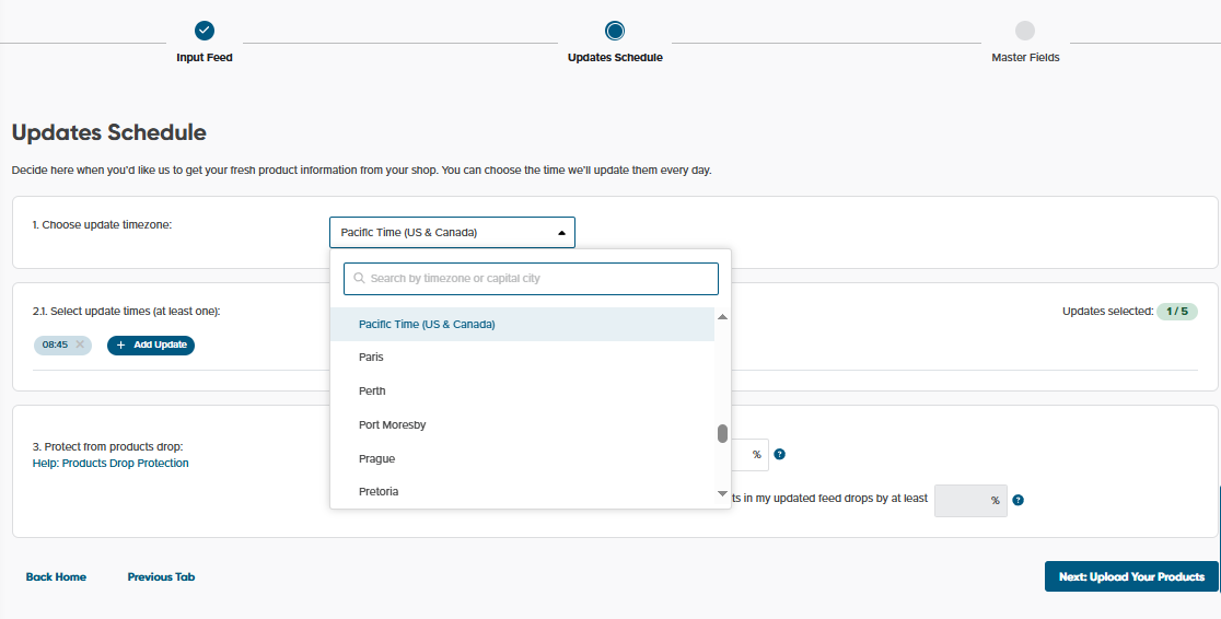 Now when you’re setting the update schedule for your shop, you can easily find the time zone you’re looking for. Just type in the time zone name or capital city of that area and it will appear in the dropdown menu.