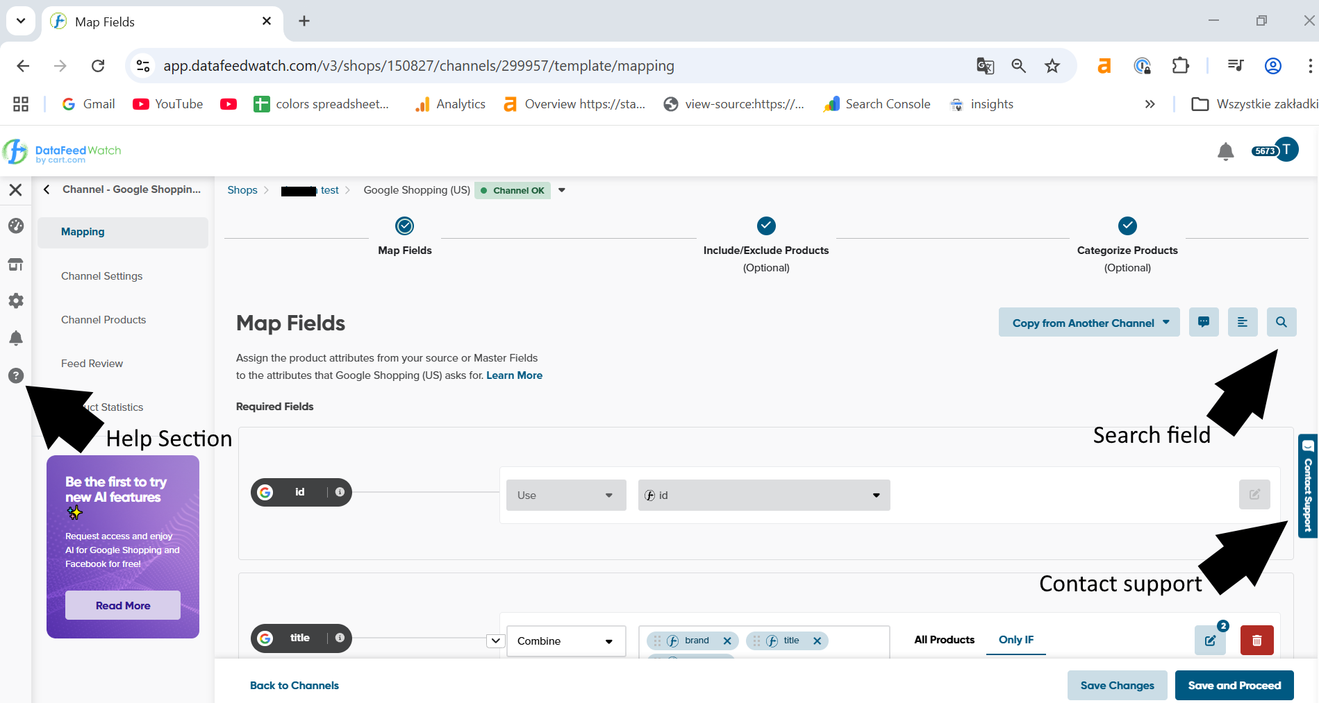 The field search can now be found at the top of the channel or mapping pages. The field search allows you to find and navigate easier to any field in a given shopping channel. Just type in the field you are looking for, click on it and we will take you directly there without having to scroll down to find it.