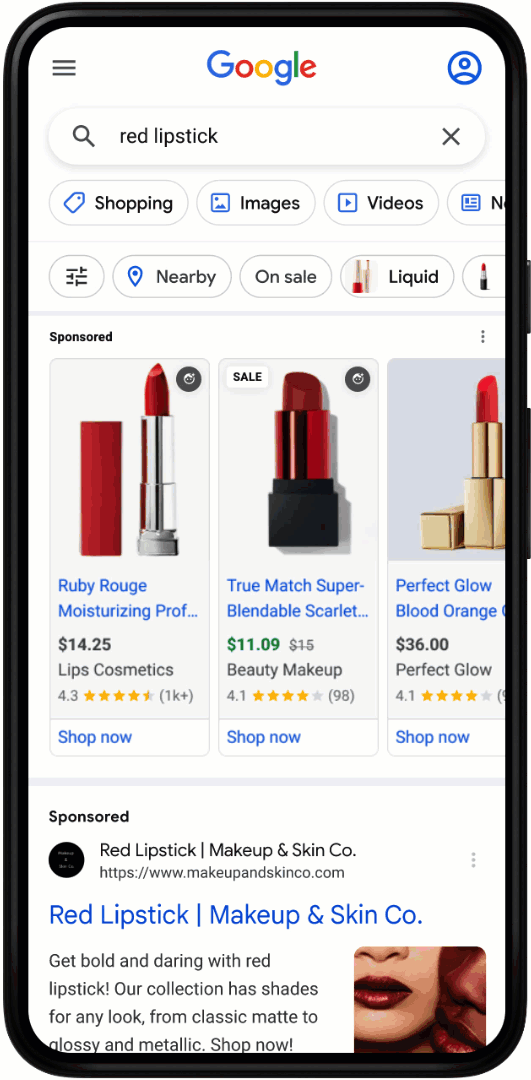 AR features include Google Ads AR beauty try-ons, virtual apparel try-ons, and 3D product displays.