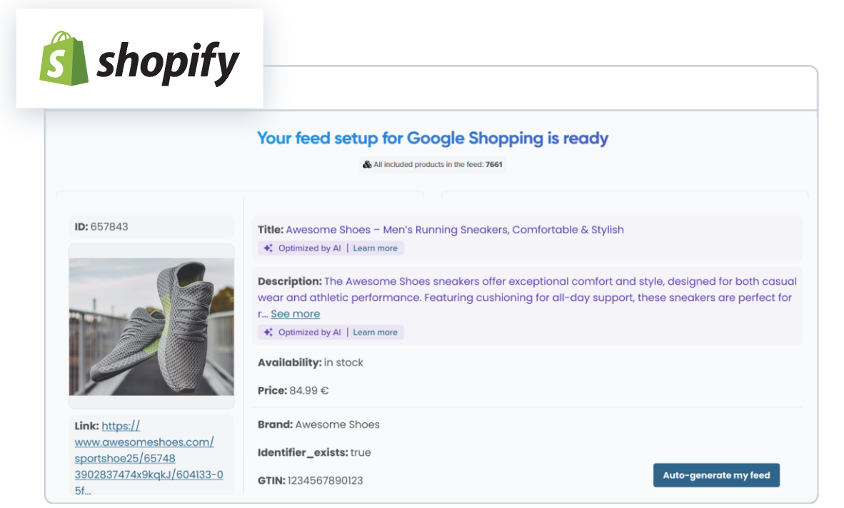 Improve relevance and performance with AI-assisted enhancements to titles, descriptions, and attributes. Automatically inject high-intent keywords, standardize attribute formatting, and surface missing data points—while preserving country-level accuracy from Shopify Markets for pricing and availability.