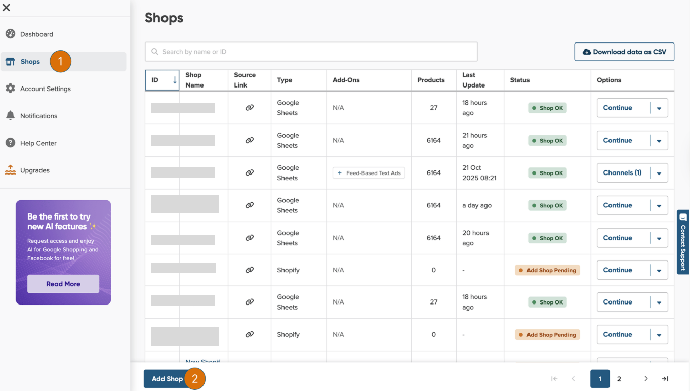 To ensure data accuracy and avoid conflicts, the Shopify Markets integration is currently available for new shops created in DataFeedWatch only.
