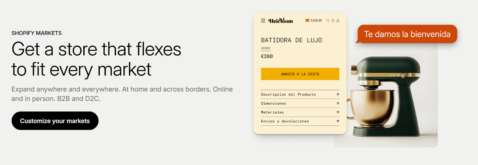 Shopify Markets is a cross-border management tool built into Shopify that helps merchants localize their storefront for international customers. It allows you to create tailored online shopping experiences for different countries or regions from a single Shopify store.