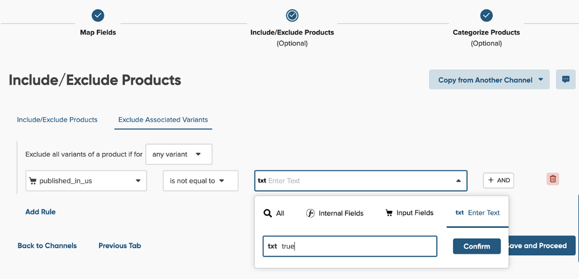 Note: In order to make sure the products you’ve excluded for certain Markets in your Shopify settings are also excluded for your ads, you’ll need to set up a quick rule in the Include/Exlude section of the feed mapping process.
