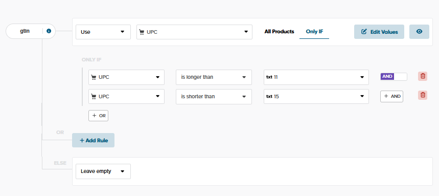 Google Shopping and other shopping channels have reinforced the use of GTINs.Most GTINs have between 12 and 14 characters based on the country, with some exceptions. To make sure that all your GTINs are within the required limit simply create a rule as the one below.