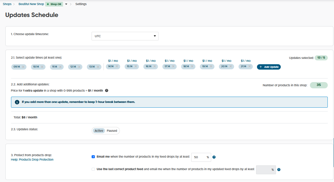 Shop: 1 free daily update, without the possibility of increasing. If you’d like to add more, our Support team will be more than happy to chat about what plan would work best for you.