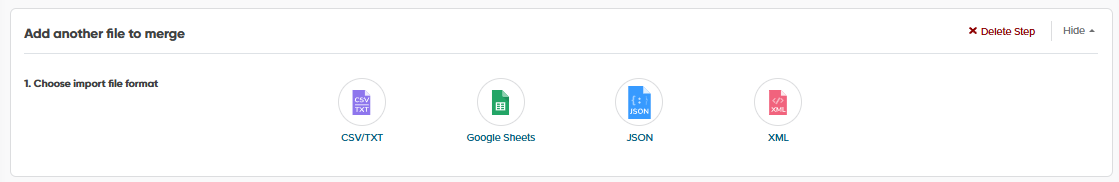 If your product data is stored in a document instead, you can also simply upload a file. The following are supported file types: .CSV/.TXT, Google Sheets, JSON, or .XML.