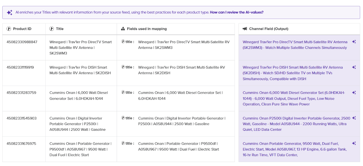 Features like bulk edit functionalities, which allow you to modify thousands of products at once, are fundamental. Beyond that, AI-driven optimization can take your feeds to the next level. An AI engine can analyze your existing titles and generate high-performing, channel-specific alternatives based on best practices.