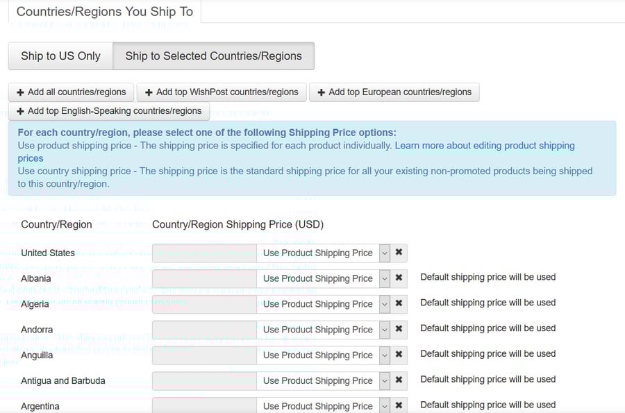 Then, for each country, decide if you’re going to use the product shipping price or the country shipping price.