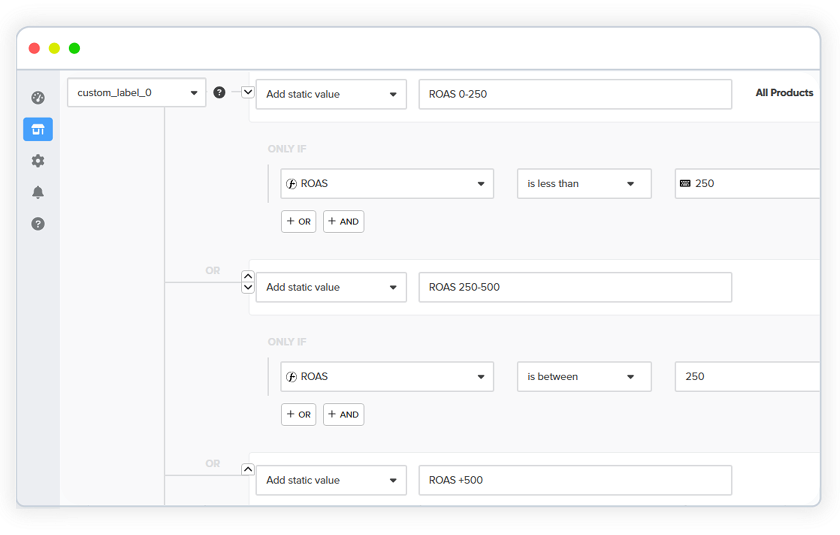Custom rule example: Improve your margins by focusing on your high-end products. Create price-based segments and bid differently on products that are below $20, between $21 to $40, and $41+.