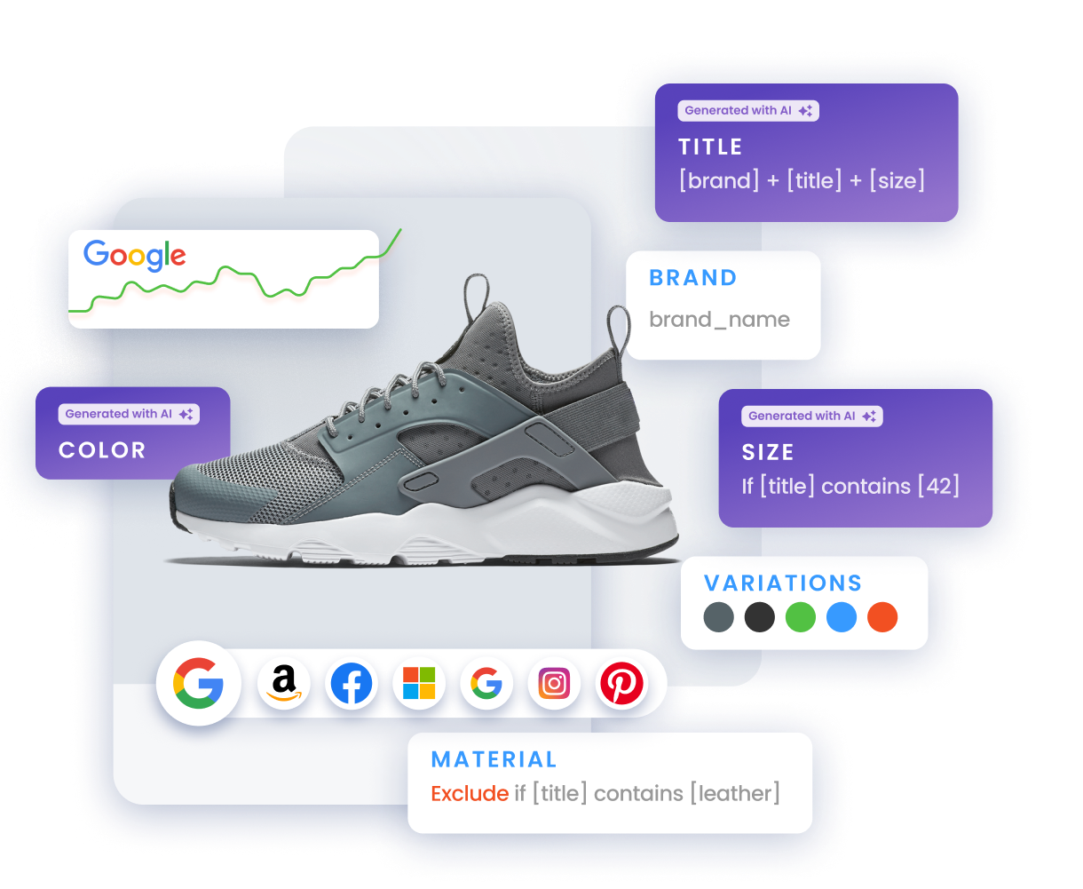 By using AI to manage your feed optimization you’ll be able to save hours of your time and have peace of mind knowing that your data is optimized according to channel best practices. DataFeedWatch AI will help you create optimized titles and descriptions, fill in data for missing size and color attributes, and categorize your products according to Google’s taxonomy - all with the click of a button.